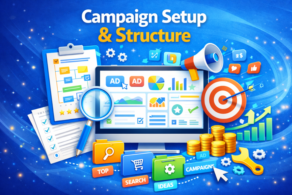 Campaigns are built with organized ad groups, targeting settings, and bidding strategies to improve quality score and performance while reducing wasted spend.